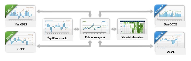 Les prix du pétrole brut sur les marchés sont déterminés par l’offre et la demande de pétrole. Dans le cas de cette matière première, on peut distinguer deux groupes au sein des pays offreurs de pétrole (pays de l’OPEP et les autres pays) et deux groupes au sein des pays demandeurs de pétrole (pays de l’OCDE et les autres pays). Le prix dépend aussi de stocks de pétrole et des marchés financiers.