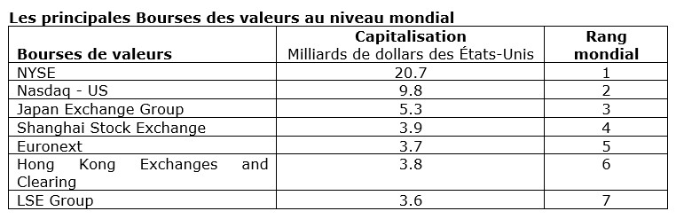 Les principales places boursières mondiales sont américaines, japonaises et chinoises. Les États-Unis accueillent 55% de la capitalisation mondiales avec le NYSE (31%) et les NASDAQ (14%) viennent ensuite, très loin derrière, la Chine avec les deux grandes places boursières que sont devenues le Shanghai Stock Exchange (5,5%) et le Shenzhen Stock Exchange (4%), sans compter le Hong Kong Exchanges (5%), puis le Japon (7,5%). La France représente moins de 3% des capitalisations mondiales au début de l’année 2021 et le Royaume-Uni 4%.