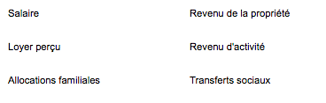 Les revenus d’activité ajoutés aux revenus mixtes et aux revenus de la propriété constituent le revenu primaire des ménages. Il fait l’objet de prélèvements (impôts et cotisations sociales) qui permettent à l'Etat de distribuer des revenus sociaux qu’on appelle revenus de transferts. Il s’agit par exemple des retraites, des allocations familiales, des indemnités de chômage ou des bourses scolaires.