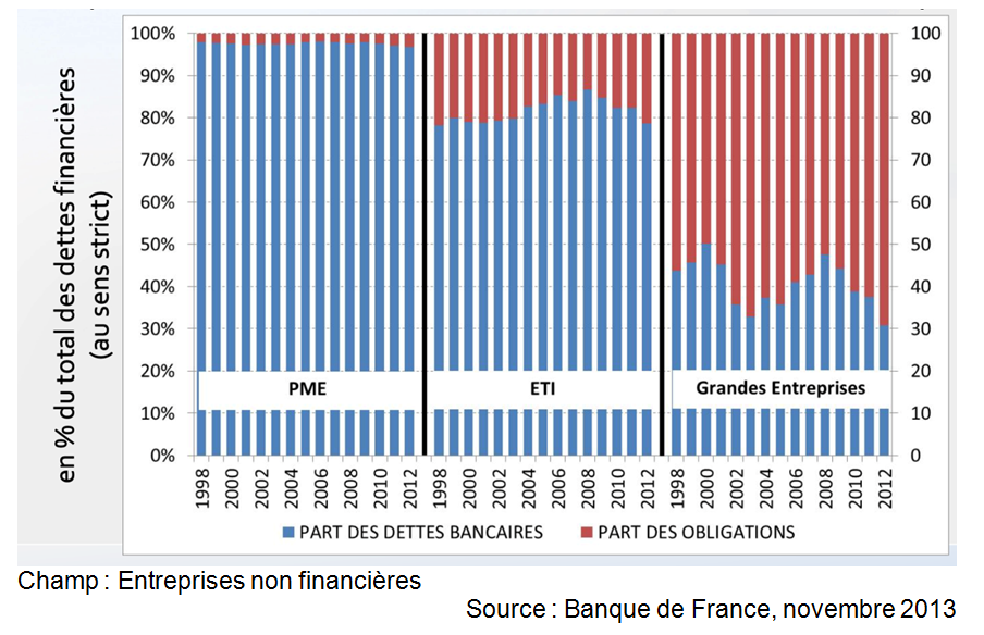- Ce document permet d’affirmer que la part des obligations dans les dettes financières a augmenté, uniquement pour les grandes entreprises (70 % de l’endettement financier en 2012 contre 57 % en 1998).