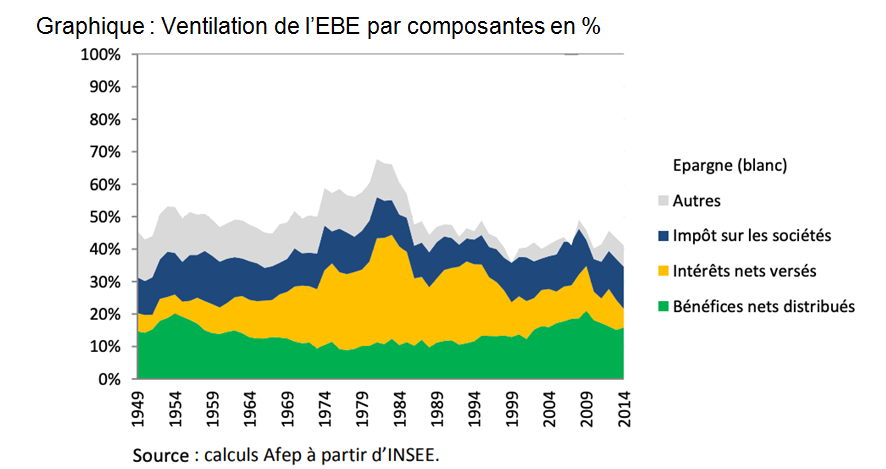 - En comptabilité nationale, le profit brut (EBE) se répartit en cinq usages : le plus important est l’épargne (59 % en 2014), qui correspond au revenu qui reste disponible pour l’autofinancement des investissements ou l’alimentation de la trésorerie. La rémunération des créanciers et des actionnaires, d’une part, et les impôts et autres éléments, d’autre part, représentent chacun 20 %.
