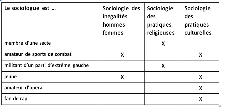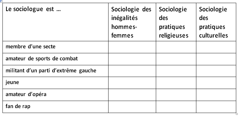 Activité 2 : Dans le cas des 3 exemples d’analyses sociologiques proposées dans le tableau, identifier les situations personnelles qui pourraient générer des prénotions chez le sociologue selon l’objet de son étude