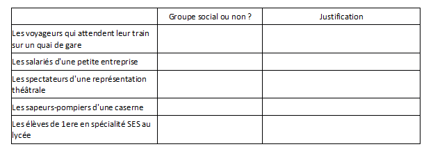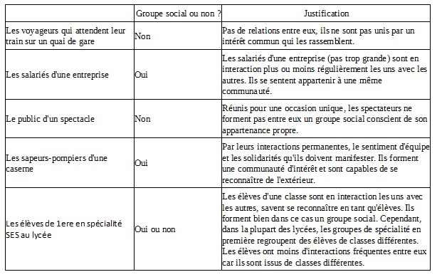 Un groupe social est un ensemble d’individus qui ont des liens entre eux qui se connaissent et se reconnaissent en tant que membre du même groupe. Ils ont donc une conscience d’appartenir à ce groupe et sont aussi perçus de l’extérieur comme membre du groupe. Les supporters d’une équipe de foot ont ces caractéristiques par exemple.