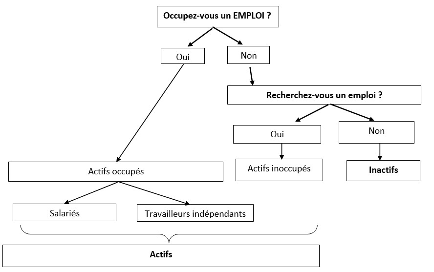 On peut classer les individus selon leur situation face à l’emploi. On distingue ainsi les actifs des inactifs. Les actifs sont les individus qui occupent un emploi ou qui en recherchent un, tandis que les inactifs sont sans emploi et n’en cherchent pas. Les inactifs sont par exemple les étudiants, les chômeurs découragés, les retraités ou les hommes ou femmes au foyer. Parmi les actifs, ceux occupant un emploi sont appelés actifs occupés et ceux sans emploi mais qui en cherchent un sont les actifs inoccupés ou chômeurs.