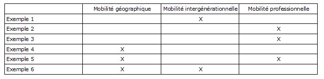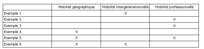 Pour chacun des cas suivants indiquez s’il s’agit d’une mobilité géographique, une mobilité intergénérationnelle ou une mobilité professionnelle. Pour chaque exemple, plusieurs réponses sont possibles.