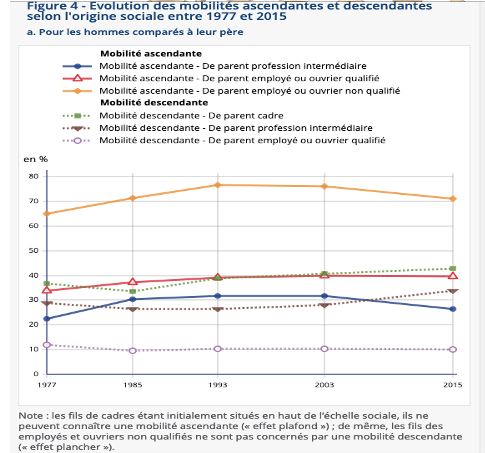 Source : Marc Collet, Émilie Pénicaud, « La mobilité sociale des femmes et des hommes : évoluions entre 1977 et 2015 » dans France portrait social, Insee Références, 2019