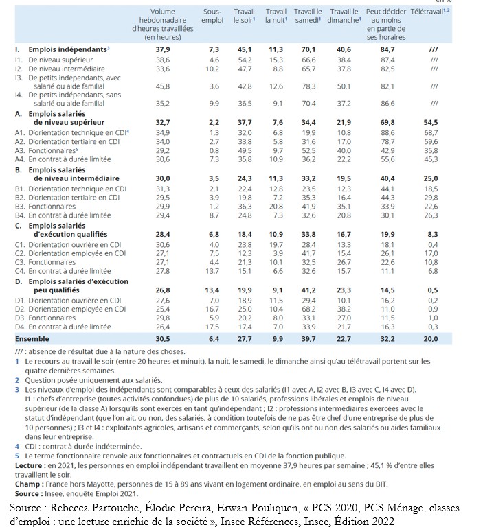 Document 1- Durée et organisation du travail des personnes en emploi par classe et sous-classe d’emploi en 2021