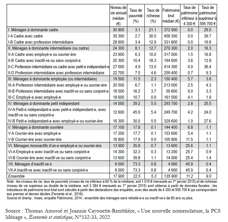 Source : Thomas Amossé et Joannie Cayouette-Remblière, « Une nouvelle nomenclature, la PCS Ménage », Économie et statistique, N°532-33, 2022