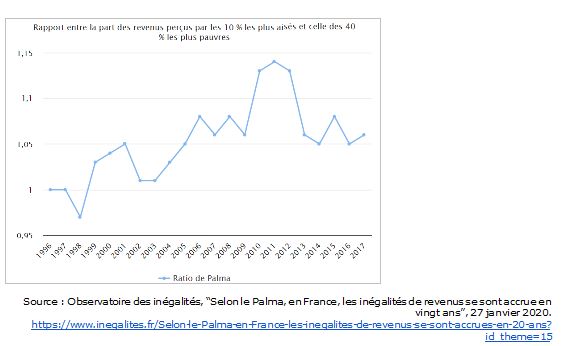 Même si le processus n’est pas linéaire, les inégalités de revenus, telles que mesurées par le ratio de Palma, ont tendance à augmenter en France depuis 1996. En effet, à cette date, les 10 % les plus aisés recevaient autant de revenus que les 40 % les plus pauvres. En 2017, les 10 % les plus aisés reçoivent 1,06 fois plus de revenus que les 40 % les plus modestes.