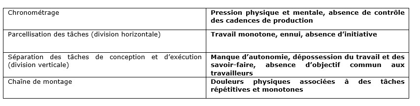 L’intensification du travail du fait du chronométrage et la soumission à un rythme de production uniforme sont susceptible d’affecter l’équilibre physique et nerveux des salariés. L’augmentation de la productivité est alors contrebalancée par une augmentation des accidents du travail, une hausse des congés maladie et un accroissement de la proportion de pièces défectueuses. […] La séparation des tâches d’exécution et de conception va à l’encontre d’une participation de l’ensemble des salariés à la vie de l’entreprise. Il est difficile de créer un esprit d’équipe dès lors que l’encadrement s’évertue à répéter à la plus grande partie du personnel qu’elle a pour fonction d’exécuter des ordres et non de prendre des initiatives.