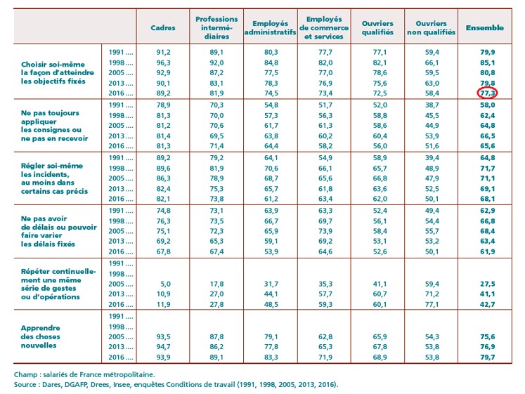 On remarque que les salariés français sont dans l’ensemble de moins en moins nombreux à « choisir eux-mêmes la façon d’atteindre les objectifs fixés » et à « ne pas avoir de délai ou pouvoir faire varier les délais fixés » avec une baisse respective de 2,6 et 1 points entre 1991 et 2016. Si ces formes d’autonomie tendaient à s’accroître jusqu’à la fin des années 1990, elles se réduisent depuis. La part des cadres qui déclarent répéter continuellement les mêmes gestes a plus que doublé entre 2005 et 2016. Les exigences d’autonomie et de flexibilité des NFOT ne semblent sur ce point pas vérifiées.
