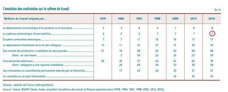 Entre 1978 et 2016, la part des salariés qui déclarent avoir un rythme de travail imposé par le déplacement automatique d’un produit ou d’une pièce a été multipliée par 2,6 c'est-à-dire qu’elle a presque triplé.