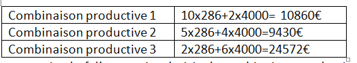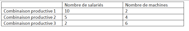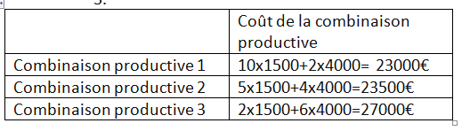 Le coût mensuel brut du travail est de 1500€ et le coût mensuel de l’utilisation de la machine est de 4000€. Calculez le coût de chaque combinaison productive et dites celle qui sera choisie par le chef d’entreprise s’il veut réaliser le maximum de profit