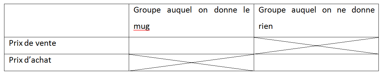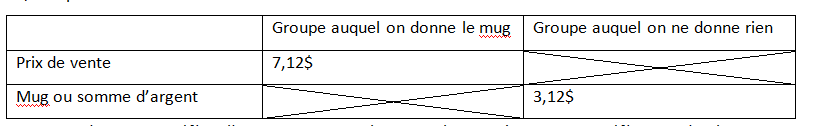 Le second groupe préfère l’argent au mug alors que le premier groupe préfère garder le mug qu’avoir la somme d’argent. L’effet de dotation est donc important.