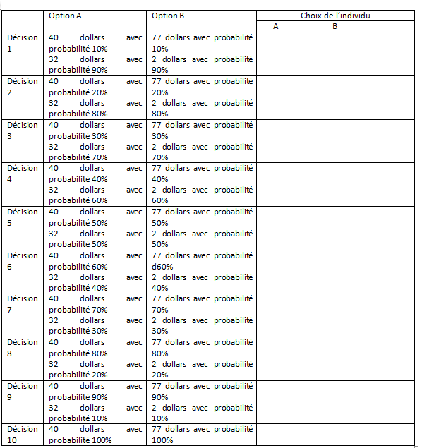 « la méthode d’évaluation de l’attitude face au risque proposé (…) repose sur deux loteries binaires : la loterie A dont l’étendue des conséquences est faible (40 dollars ou 32 dollars) et la loterie B (77 dollars ou 2 dollars) dont l’étendue des conséquences contient celle de la loterie A. La méthode consiste à accroitre la probabilité du gain élevé pour les deux loteries simultanément afin de déterminer la décision pour laquelle le choix du sujet « bascule » de la loterie A (la loterie sûre) vers la loterie B (la loterie « risquée »)