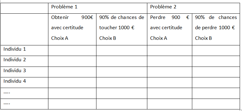 1/ Face au problème 1, comme la grande majorité des gens éprouve une aversion au risque, le choix majoritaire va être le gain certain de 900 euros.