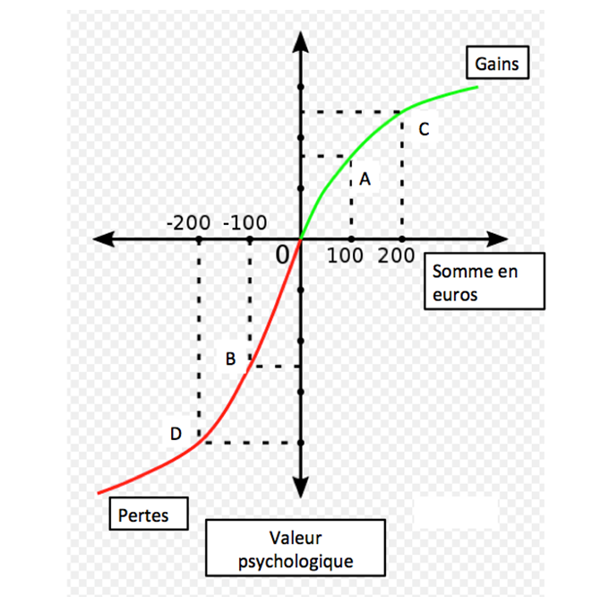 1/ La comparaison du point A et du point B montre qu’un gain de 100 euros apporte un supplément de satisfaction à l’individu (point A) qui est plus faible en valeur absolue que la perte de satisfaction liée à une perte de 100 euros (point B): c’est l’aversion à la perte.