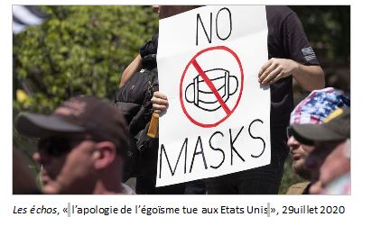 2/ Dans le monde occidental en particulier, de nombreuses manifestants récalcitrants au port du masque se sont opposées aux mesures imposées par les gouvernements au nom de la liberté individuelle. Les gouvernements ont pris des mesures plus ou moins contraignantes pour endiguer la pandémie, les représentations du risque diffèrent d’une société à l’autre mais aussi d’un individu à l’autre. La représentation du risque est bien une construction sociale.