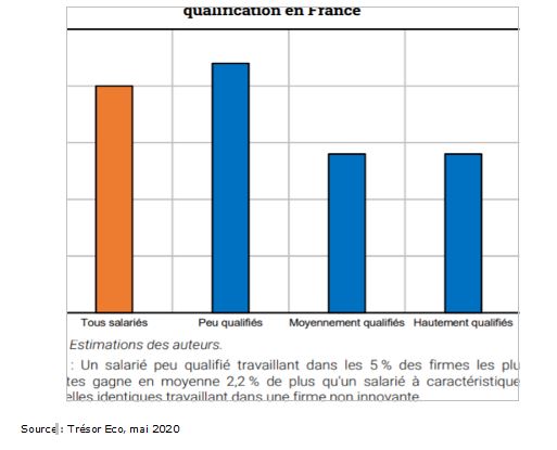Il montre que d’une manière générale, les salariés (toutes qualifications confondues) travaillant dans des entreprises innovantes gagnent 2 % de plus que la moyenne. Mais cet avantage est plus net pour les salariés les moins qualifiés dont l’avantage relatif est de 2,2 %. Le fait de travailler dans une firme qui réalise des investissements en R&D bénéficie donc davantage aux travailleurs peu qualifiés qu'aux travailleurs à hautes qualifications, ce qui peut sembler un constat contre-intuitif.