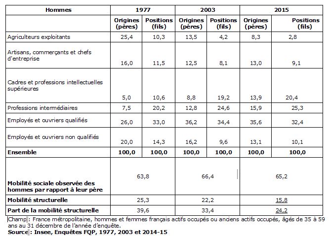 Une partie de la mobilité sociale masculine observée en 2015 résulte directement de l’évolution de la structure des emplois entre les générations d'hommes nés entre 1955 et 1980 et celles de leur père. Cette mobilité dite « structurelle » reflète les profonds changements de la société française depuis la fin des Trente Glorieuses : poursuite du déclin de l’emploi agricole, baisse de l'emploi industriel, salarisation et tertiarisation croissantes de l’économie se sont traduites par une baisse du nombre de travailleurs indépendants et d’ouvriers, au profit des emplois de cadres et professions intermédiaires. En 2015, 24 % de la mobilité sociale masculine observée correspond à de la mobilité « structurelle ».