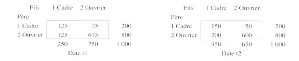 1/ Dans chaque table, on peut lire le nombre des immobiles sur la diagonale : dans la première table, 800 personnes occupent la même position sociale que leur père (675+125) alors qu’il y en a 750 dans la seconde table (600+150). En t1, il y a donc 80 % d’immobiles et 20 % de mobiles. Dans la seconde, il y a 75 % d’immobiles et 25 % de mobiles.