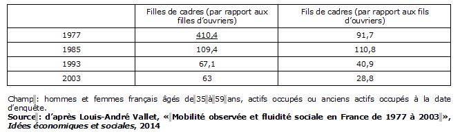 1/ En 1977, les filles de cadres ont plus de 410 fois plus de chances que les filles d’ouvriers d’atteindre une position de cadres selon des calculs effectués par Louis-André Vallet.