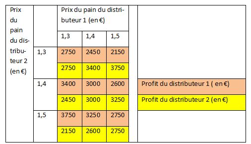 Deux entreprises se disputent la distribution de pains dans un village isolé. Comme les relations entre les deux distributeurs sont très mauvaises, ils n’ont aucun contact entre eux et chacun fixe unilatéralement le prix du pain, sans connaître à l’avance le prix de l’autre. Voici les profits que chacun prévoit en fonction de ses prix et de ceux de son concurrent :