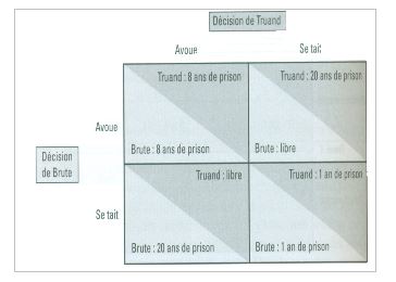 Réponse : Les deux ayant intérêt à avouer, avouent, et prenne chacun la même peine de 8 ans d’emprisonnement. Cette situation est défavorable pour les deux, car si tous les deux étaient restés silencieux, leur situation aurait été meilleure, ils n’auraient écopé que d’une année de prison pour détention d’armes. C’est le résultat de la recherche de leur intérêt individuel.