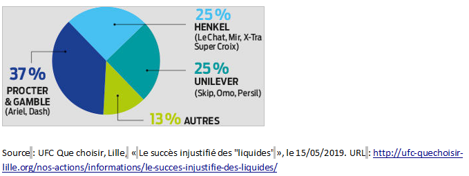 Réponse : Le marché des lessiviers est un marché oligopolistique car le taux de concentration s’élève à 87%. En effet, 87% des ventes sont effectuées par 3 lessiviers : Procter & Gamble, Unilever, Henkel, les 13% restant sont répartis entre un nombre important d’entreprises mais qui sont négligeables en termes de part de marché et donc de chiffres d’affaires.