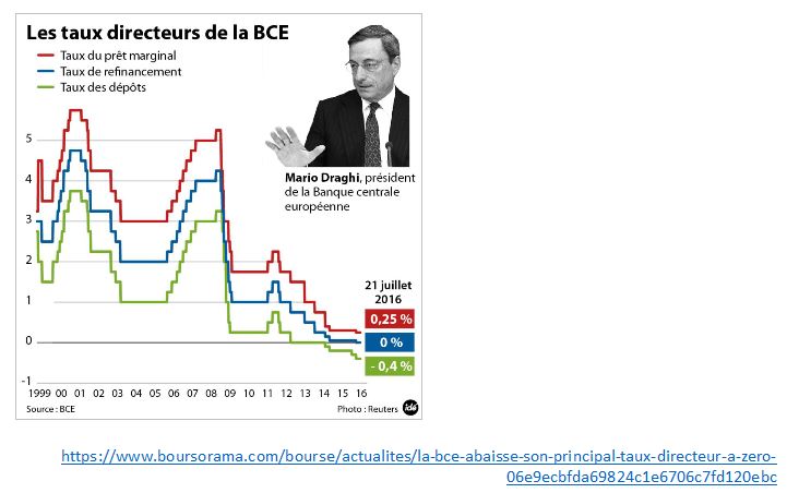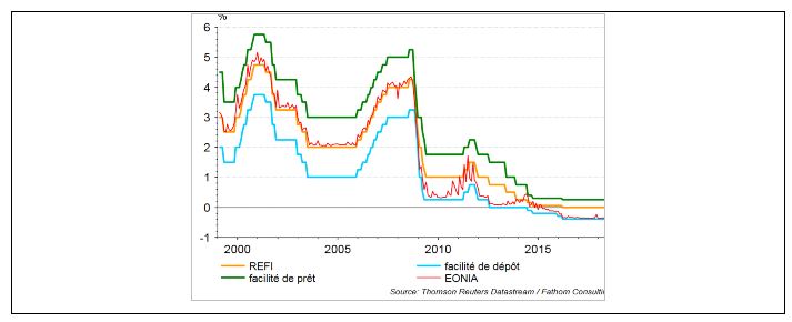 Hormis une légère remontée en 2011, les taux directeurs ont été progressivement abaissé au point que le taux de facilité de dépôt est négatif et ce, depuis 2014.