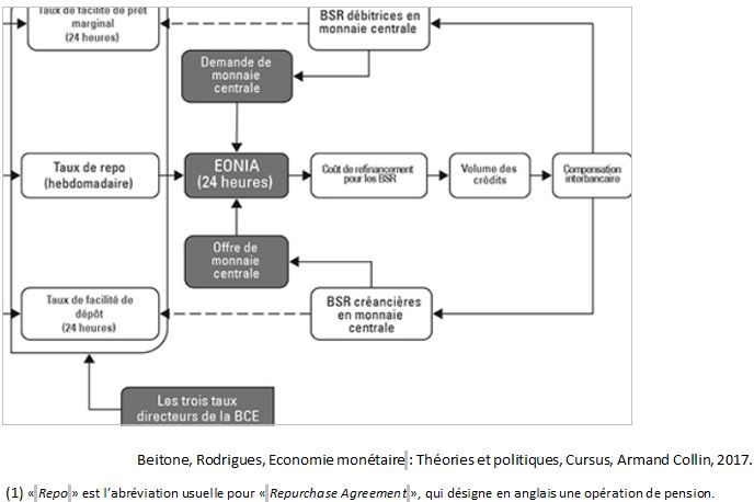 (1) le taux de refinancement (opérations d’open market) : c’est le principal taux directeur autour duquel fluctue le taux du marché monétaire au jour le jour (Eonia) ;