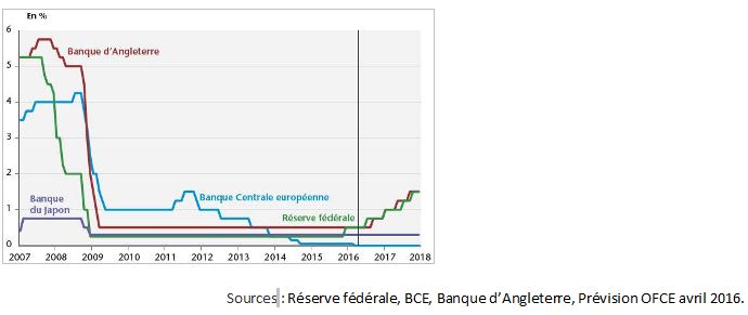 Taux directeur des banques centrales d’Angleterre, du Japon, des Etats-Unis (Réserve fédérale) et de la zone euro (Banque centrale européenne) :