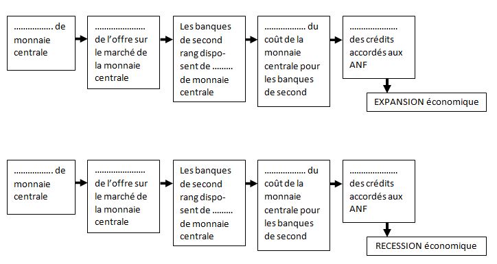 Complétez le schéma avec les propositions suivantes et entourez en bleu le mécanisme correspondant au canal du crédit et en rouge celui correspondant au canal du taux d’intérêt.