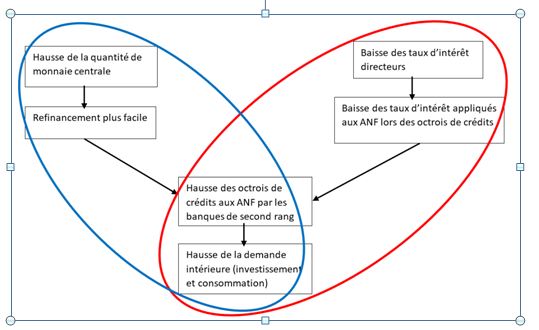 Hausse des octrois de crédits aux ANF par les banques de second rang ; Hausse de la quantité de monnaie centrale ; Hausse de la demande intérieure (investissement et consommation) ; Baisse des taux d’intérêt appliqués aux ANF lors des octrois de crédits ; Refinancement plus facile Baisse des taux d’intérêt directeurs