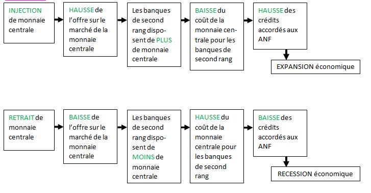 L’injection (ou le retrait) de liquidités par la banque centrale sur le marché de l’argent au jour le jour accroît (fait baisser) les réserves des banques qui réagissent par une augmentation (diminution) des crédits distribués et une baisse (hausse) de leur prix car le coût de leurs ressources diminue (augmente). Les entreprises et les ménages ont alors moins de difficultés pour financer leurs dépenses, ce qui stimule la demande globale et accélère la croissance.