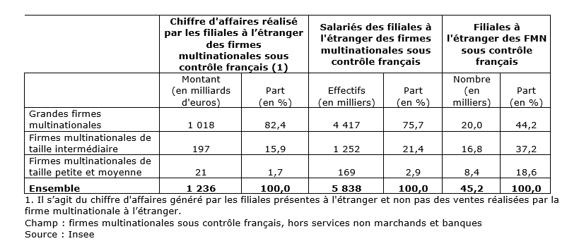 Selon l’Insee, les filiales des grandes firmes multinationales françaises réalisaient un chiffre d’affaires à l’étranger de 1018 milliards d’euros en 2016, soit 82,4% des ventes, contre 197 milliards d’euros (15,9%) pour les FMN de taille intermédiaire et 21 milliards d’euros (1,7%) pour les FMN de taille petite et moyenne.