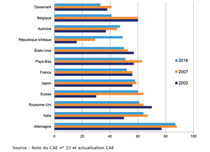 Selon le CAE, la France place 52 secteurs dans le « top 10 » de l'OCDE sur la compétitivité hors-prix, sur 102 secteurs analysés en 2016 contre 56 secteurs en 2000.