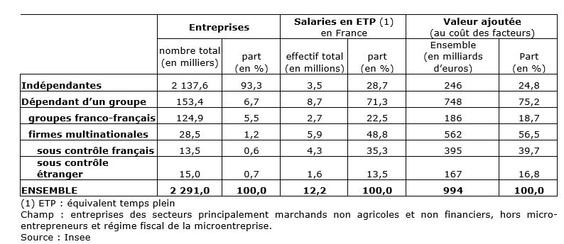 Selon l’Insee, en 2017, 28 500 firmes multinationales, soit 1,2% des entreprises, emploient près de 5,9 millions de salariés en équivalent temps plein, soit 48,8 % des salariés en France des entreprises organisées en groupe de sociétés. Ces firmes multinationales dépendantes d’un groupe génèrent 562 milliards d’euros de valeur ajoutée soit 56,5% de la valeur ajoutée des firmes en France en 2017.