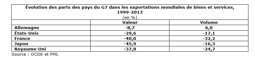 Selon les calculs de l’OCDE et du FMI, la France a enregistré une diminution de 40% de sa part dans les exportations mondiales de biens et services en valeur entre 1999 et 2013 et une diminution de 32,2% de sa part dans les exportations mondiales de biens et services en volume sur la même période.