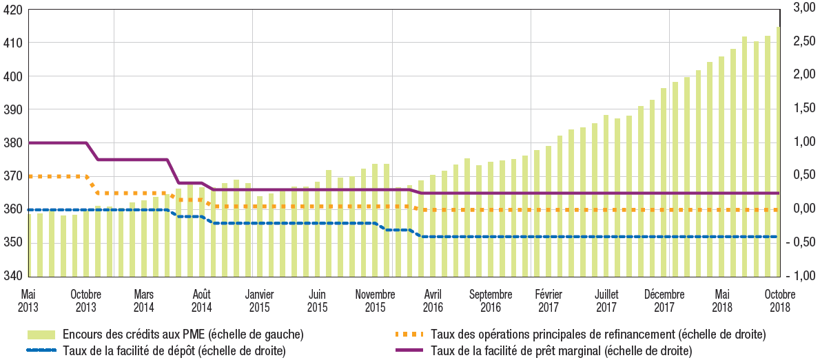Document 4 : Encours des crédits aux PME en France et taux directeurs en zone euro (encours en milliards d’euros ; taux en %)