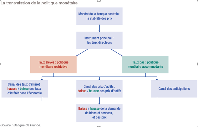 Les taux directeurs agissent sur l’activité économique et les prix par l’intermédiaire de différents canaux de transmission. En baissant son principal taux directeur, la Banque centrale facilite le refinancement des banques de second rang. Celles-ci vont répercuter la baisse sur les taux d’intérêt qu’elles proposent aux ménages et aux entreprises (canal des taux d’intérêt). Ces derniers vont s’endetter plus facilement via le crédit afin de consommer et d’investir davantage. La baisse du taux directeur se répercute aussi sur les taux d’intérêt des obligations (canal des prix d’actifs). Les agents économiques vont alors préférer orienter leur épargne vers les actions, ce qui va faire s’élever leur prix. La valeur des portefeuilles en actions va augmenter, rendant leurs détenteurs potentiellement plus riches, ce qui va les inciter à plus consommer. Enfin, en s’engageant de manière claire et crédible, la Banque centrale réduit l’incertitude des agents économiques quant aux variations de son taux directeurs (canal des anticipations). Cela influence immédiatement leurs décisions en matière d’investissement et de consommation.