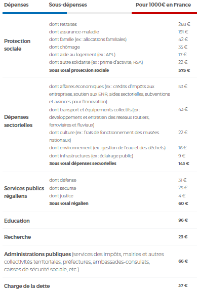 - En France, sur 1000 euros de dépenses publiques, 31 euros sont consacrés à la Défense et 96 euros à l’éducation en 2019 d’après le Ministère de l’économie.