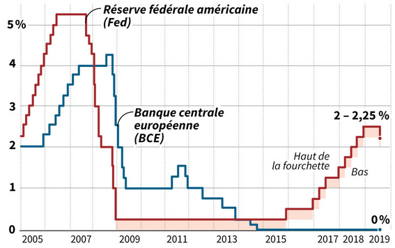 Sur la même période, la Fed a aussi mené une politique monétaire accommodante. Elle a cependant diminué de manière plus forte son taux directeur (de 4,25 % à 0,25 %), et quelques mois avant la BCE.