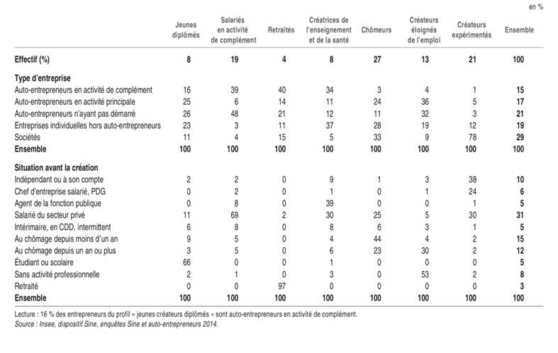 On constate que 27% des créateurs d’entreprise sont des chômeurs, tandis que 19% créent une activité de complément. On remarque également que 69% des entrepreneurs du profil « salariés en activité de complément » sont issus du secteur privé. Parmi les créateurs éloignés de l’emploi, 30% sont au chômage depuis un an ou plus. Parmi les créateurs expérimentés, 38% sont indépendants ou à leur compte. 29% de l’ensemble créent des activités sous forme de sociétés.