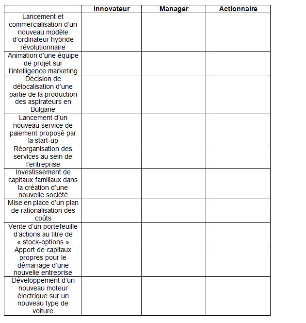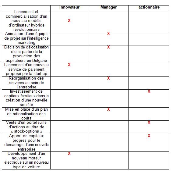 Cocher dans le tableau suivant la fonction de l’entrepreneur qui correspond à l’exemple proposé