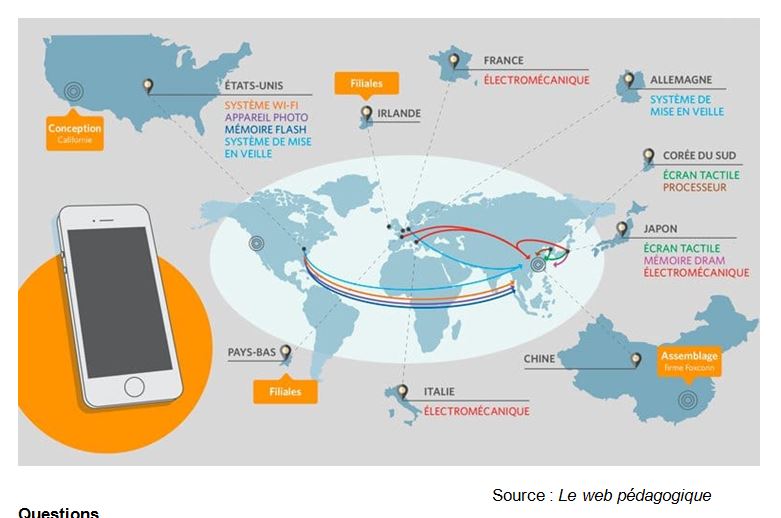 La production de l’iPhone montre qu’il est le résultat d’un assemblage de pièces détachées fabriquées dans différentes parties du monde afin de rationaliser les coûts, mettre en concurrence les fournisseurs, et diversifier les approvisionnements.