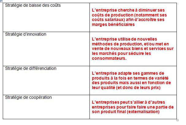 L’entreprise peut, par des stratégies d’internationalisation, améliorer sa compétitivité prix (baisse des coûts par des stratégies de délocalisations par exemple) et sa compétitivité hors-prix (meilleure qualité des produits en bénéficiant des savoir-faire et des approvisionnements situés sur différents territoires).