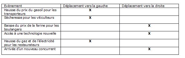 Indiquer dans le tableau si les facteurs présentés amènent un déplacement de la courbe d’offre vers la gauche ou vers la droite