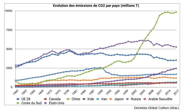 Les pays qui emettent le plus de CO2 aujourd'hui sont la Chine, les Etats-Unis et l'Union européenne.