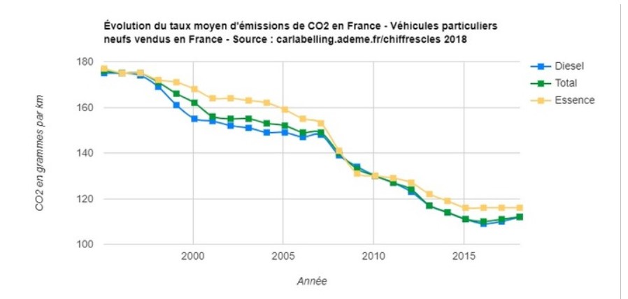 Le document 1 montre la diminution des emissions de CO2 des véhicules neufs vendus en France. Cette diminution peut être une conséquence de la réglementation de plus en plus stricte que les constructeurs doivent appliquer dans l'Union européenne mais aussi des mesures de taxation et de subvention aux innovations vertes comme le bonus-malus écologique par exemple.